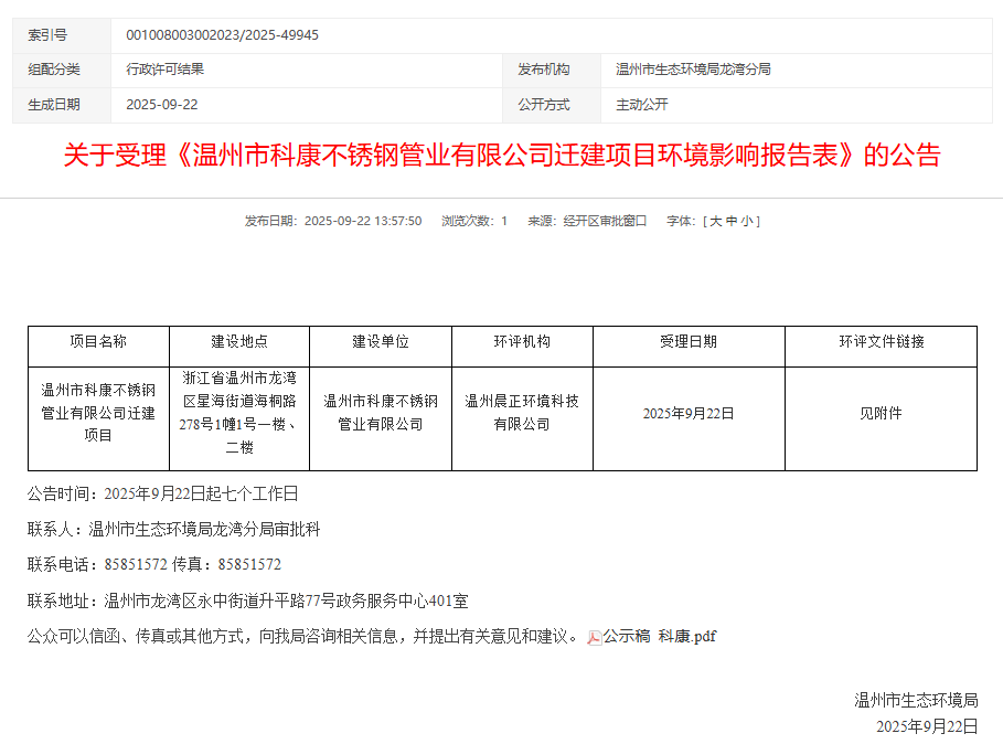 2025年9月22日,温州市生态环境局受理温州市科康不锈钢管业有限公司迁建项目环境影响报告表并对外进行公告,公告期:7个工作日。