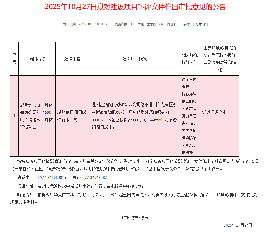 2025年10月27日,温州市生态环境局就温州金拓阀门球体有限公司年产600吨不锈钢阀门球体建设项目环境影响报告表作出审批意见并对外进行公告,公告期:5个工作日。