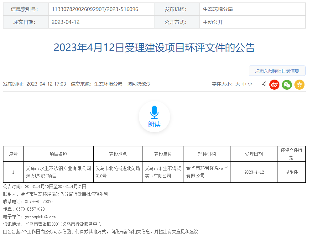 4月12日,金华市生态环境局义乌分局受理义乌市永生不锈钢实业有限公司退火炉技改项目环境影响评价报告表并对外进行公告,公告期:7个工作日。